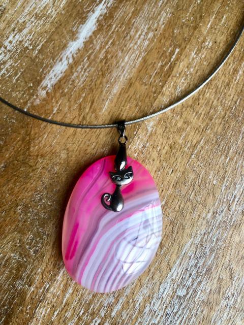 Náhrdelník Achát růž 5 x 3 cm, jemně zaoblený, s ocelovou kočkou. Na ocelovém lanku 47 cm nebo ocelovém řetízku. Délka řetízku 55, 60 nebo 65 cm. Jediný kus. JK Design.